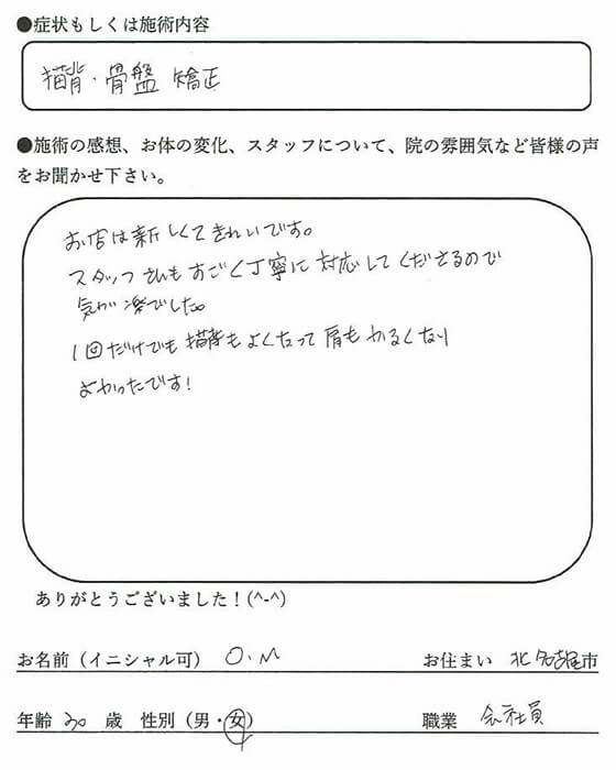 ・猫背が酷くなっていましたが施術後とても楽になりました。